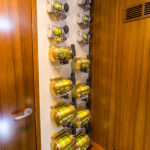 Customized teak bar stools in the Weaver 80’s saloon. They are designed especially for the owner, who is 6 feet 5 inches tall.