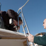 A portion of the flying-bridge rail had to come out before the new top could be hauled aboard and positioned.