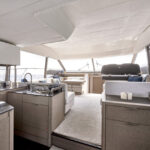 Prestige has always prided itself on offering owners a rich and inviting interior with plenty of natural light. The Prestige 590 continues this tradition offering a a main salon with enormous windows and a 360 degree view to life outside. The space itself from the nicely appointed aft galley with easy access to the cockpit all the way forward to the helm station is open and uncluttered with plenty of comfortable seating, a true hallmark of the Prestige brand.