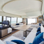 Powered by twin Cummin 8.3 liter diesel engines with Zeus pods and joystick control enable the Prestige 590 to reach a maximum speed of 29 knots while at the same time allowing for plenty of maneuverability around docks. Ship Control, an integrated onboard computer system with roots in the car industry, brings together all the ship’s systems into one convent touch screen display.