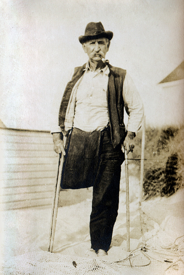 A photo shows him standing on a beach, holding a cane in each hand, trouser leg pinned up, net strewn in the sand, pipe between his teeth. He levels the same hard look displayed by family members across the generations that are etched both in my memory and in photographs. My great-grandfather and his sons, commercial fishermen all, had long, sad, windburned faces. Maybe they didn’t start out tough, but they were eventually tempered by their circumstances. During the Great Depression, my grandmother dropped off bags of groceries at their homes.