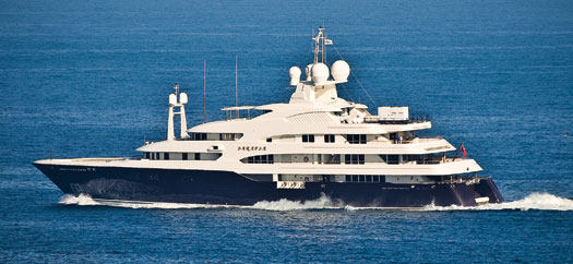 #3: PRINCE ABDULAZIZ—482’3″King Abdullah of Saudi Arabia conducts official business aboard but also uses the yacht for relaxation, notably when Prince Abdulaziz is anchored at the royal compound in Marbella, Spain. It took 15 months just to complete the interior of this massive vessel, which reigns as the largest yacht built in the 20th