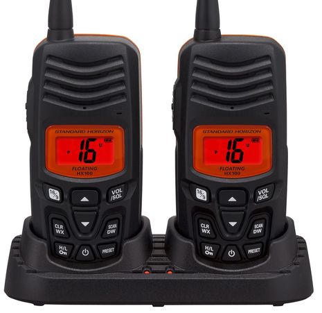 But in terms of sheer value, I suspect it’s hard to beat a “twin pack” of relatively new Standard Horizon HX100 handhelds, which I see at Defender for $135. They can only transmit at 2.5 Watts maximum — as opposed to the 6 Watts the other handhelds can manage — but that should do the job around marinas and harbors, and the HX100 does float like the others…