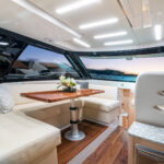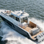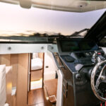 The Coupe version is similar in profile view to its center console sistership. She sports huge fold-down gunwales, wide side decks and quad Mercury outboards. Looking forward from the cockpit is where you really get a sense of how different this boat’s mission is—a large sliding door leads you to an entirely protected and climate-controlled salon and helm.