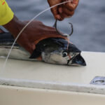 The thrum of the diesels, a tropical sun and the boat’s gentle roll had worked me into a mild hypnotic state. I was sitting on the port engine box early that afternoon, sun-blasted, day-dreaming, brain on pause, when a blue marlin pushing 400 pounds surfaced in the spread and snared a 3-pound tuna bridled to an 18/0 circle hook as easily as a tall boy plucks an apple from a tree.