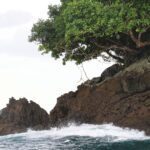 After a night of rain, a waterfall cascaded down a slick ledge and fell into the salt. Sea caves dotted the shoreline, and mist shot out of blowholes in the rocks with each good wave that came ashore. Numerous small slides marked the vertical faces of the hills, where trees rose three and four stories high.