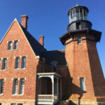 We follow the signs toward the southeast lighthouse, parking the mopeds on a dusty elbow alongside the road. There, on an exposed point atop the bluffs, sits the imposing red brick tower and keeper’s dwelling. Instinctually, we all perform the tourist’s raison d’être: We look up.
