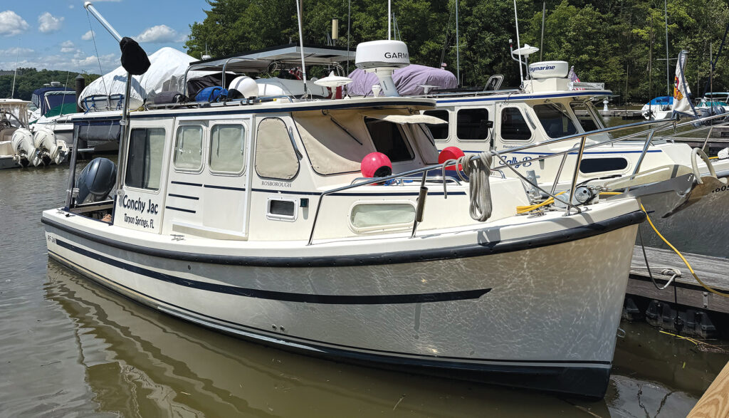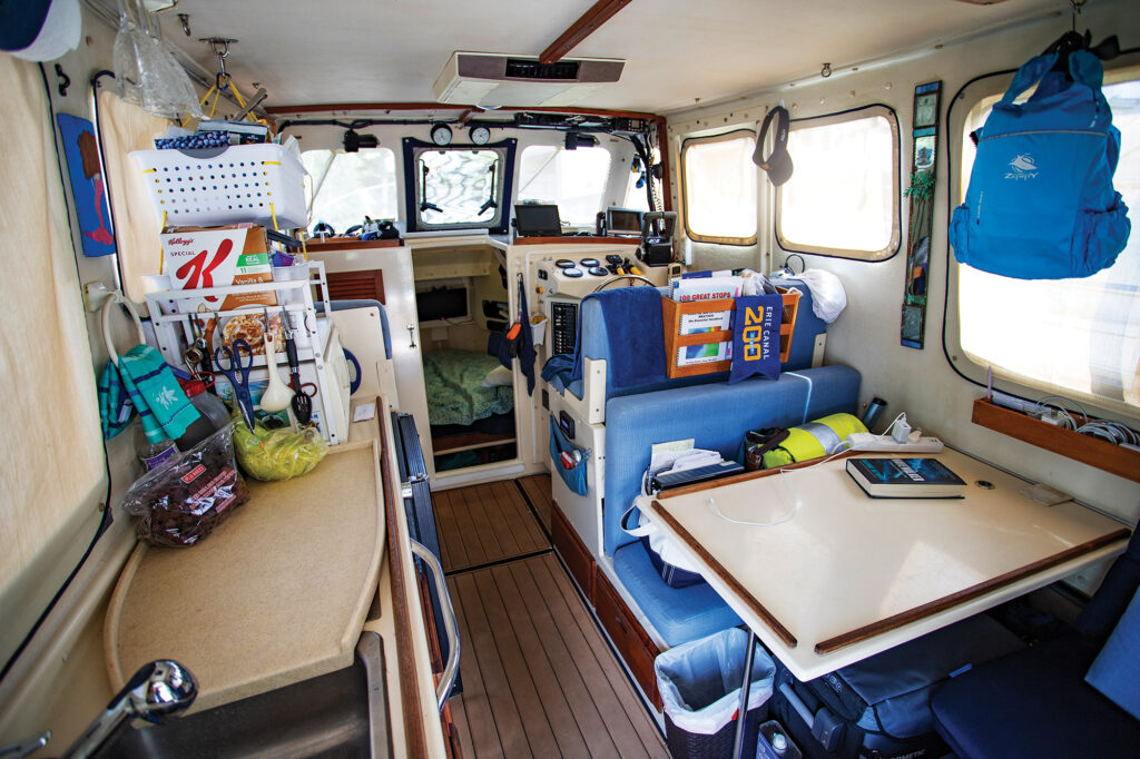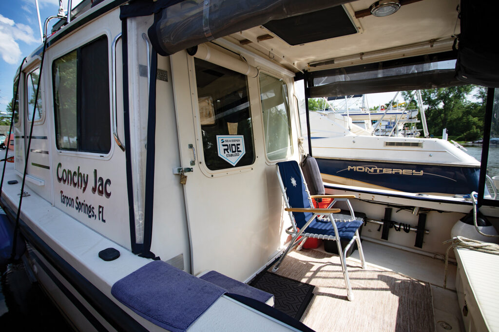 “Now, you’ve got to remember most people that buy a boat are a couple, so there are two voices about what’s the best boat for the Great Loop,” she says. “And me? I’m also the mechanic and engineer, so I don’t want the fluff and luxuries because that’s just more to fix. It’s got to be a compromise between comforts and less time fixing stuff. I have two side doors, she’s sturdily constructed, and she has (twin Yamaha) outboards. I mean, there’s just nothing better. I’ve got a microwave, TV, shower—she’s got everything you need to do the Loop. And I can have one guest. I tell them their max limit is one week, then they’ve got to get off—there’s just not enough room for more than that.”